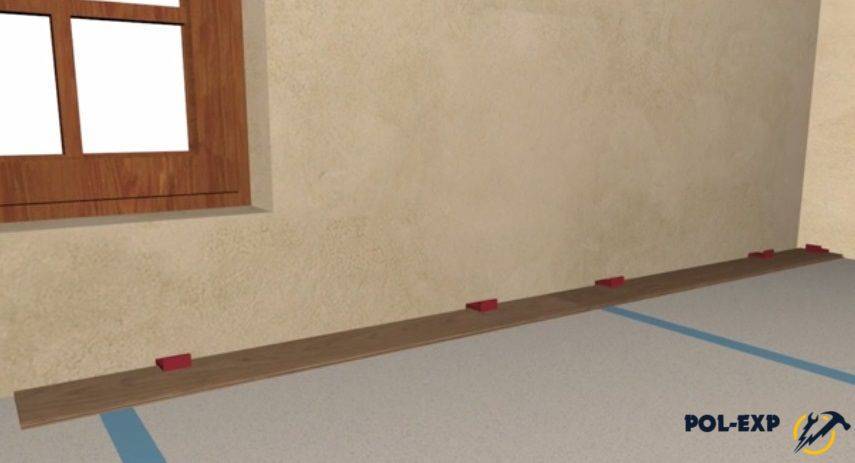 Шаг 6. Между первой доской и стеной устанавливаются клинья, позволяющие обеспечить деформационный зазор.