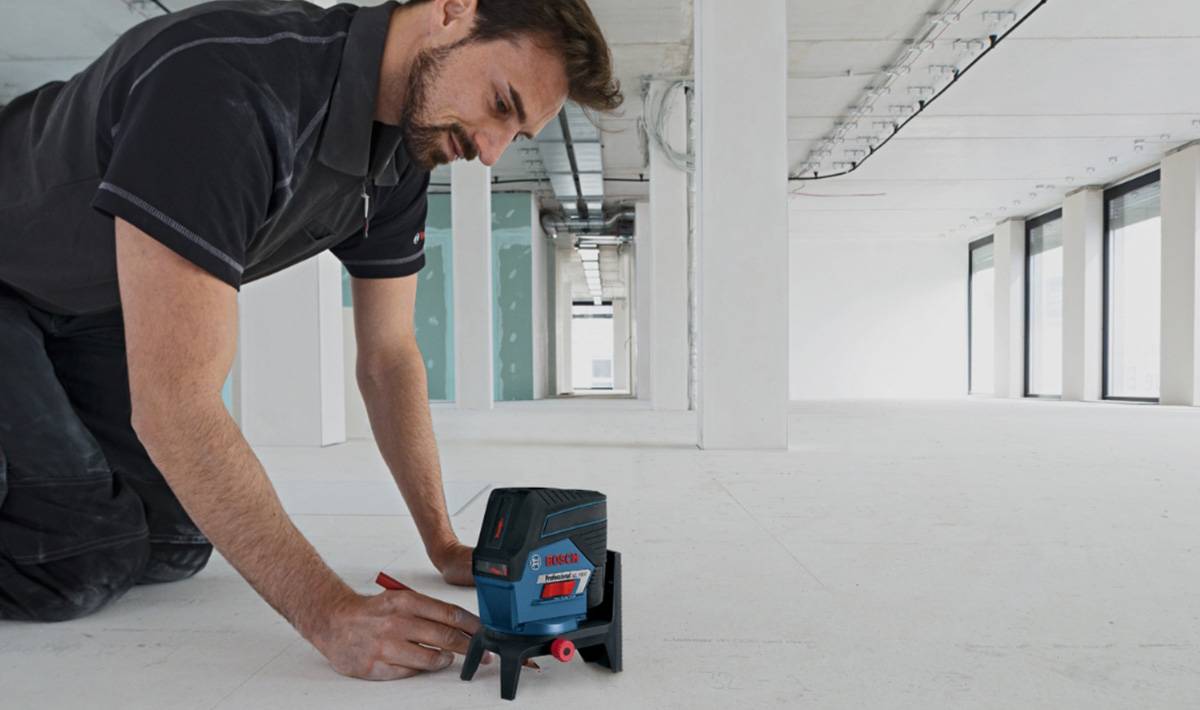 Для удобства нахождения стартовой точки проще воспользоваться лазерным уровнем. За отчетную единицу можно взять любую высоту, например, 100 см. По выставленному лазеру с помощью рулетки обследуют всю поверхность, наблюдения отражают карандашом или маркером на полу или стенах.