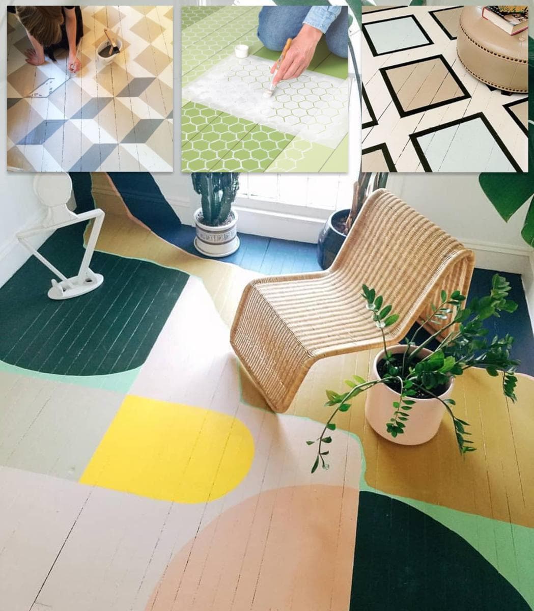 Можно проявить собственные творческие способности и создать на полу геометрический, цветочный или абстрактный рисунок. С этой целью необходимо предварительно разработать схему, затем подготовить в реальном размере трафареты. Сначала окрашивают весь пол в основной тон, дают ему просохнуть, а затем через трафарет наносят орнамент или рисунок.