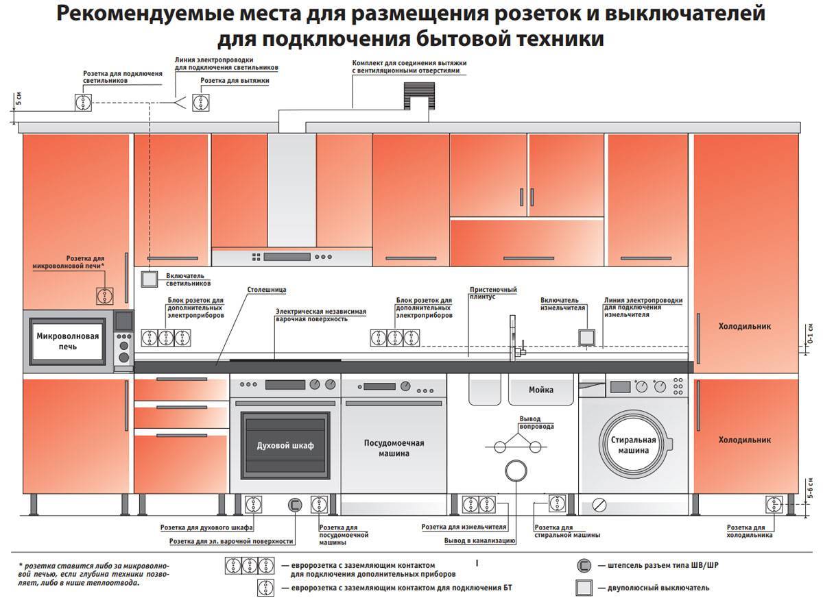 Также вверху на высоте 1,9м-2,0м выводится розетка под вытяжку. Однако многое может зависеть от марки. Если это дешевый вариант, то можно обойтись выводом кабеля и затем подключить его прямо внутри техники.