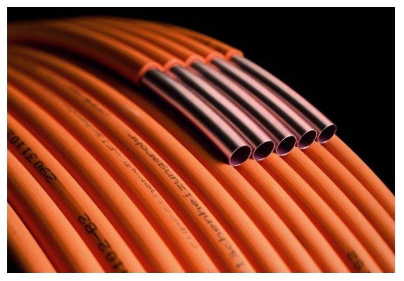 - медь. Прочный, стойкий к коррозии вариант. Труба хорошо гнется, можно уложить весь контур цельным куском, нет необходимости в сваривании участков. Минусы – дорого; медный пол сложно уложить дилетанту.