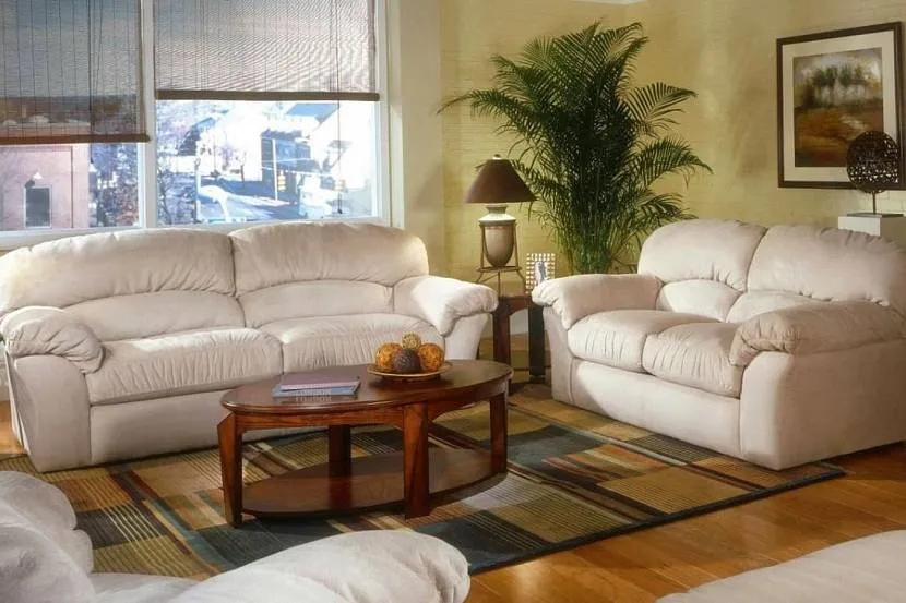 Для этой гостиной было выбрано крупное комнатное растение в массивном пластиковом горшке. Оно придает интерьеру эффектный и даже восторженный вид.