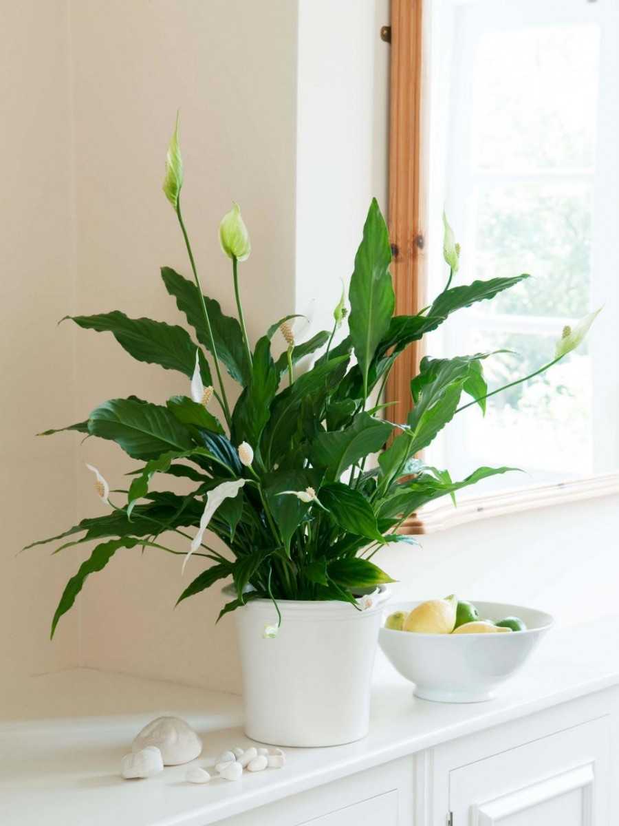 Спатифиллум – постоянно вырабатывает кислород, увлажняет и очищает воздух от ядовитых примесей, нейтрализует аллергены. При этом, цветок красиво цветет.