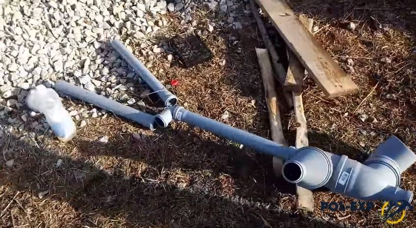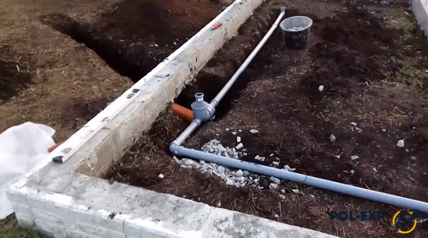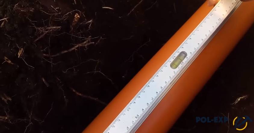 Шаг 3. Подровняйте дно и уложите пластиковые трубы. Делать песчаную подсыпку не нужно, глубина траншей незначительная, канализация не будет испытывать большого давления. Если принимать уровень слива в парной за нулевую отметку, то максимальная глубина траншеи на выходе из бани шириной 6 м будет примерно 25–30 см. Не нужно бояться, что вода замерзнет в зимний период времени. Во-первых, она теплая. Во-вторых, наклон обеспечивает полный слив, трубы всегда пустые, замерзать нечему.