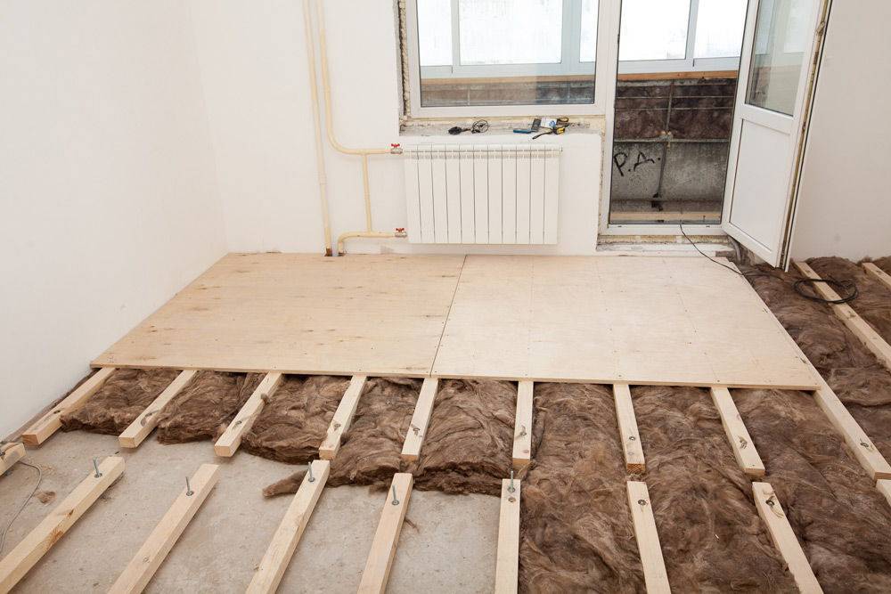 При использовании технологии регулировки пола на лагах для улучшения изоляционных свойств конструкции следует заранее приобрести теплоизоляционные маты или любые рулонные материалы, которые укладывают после обустройства каркаса между лагами.