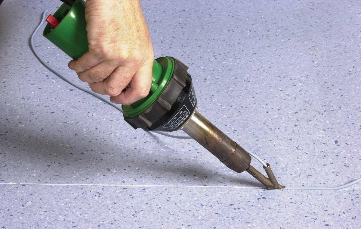 Для работы понадобится сварочный фен с насадками и специальные шнуры под цвет линолеума.
