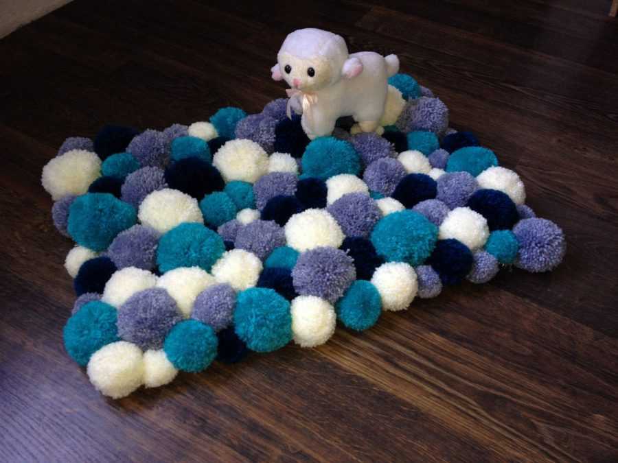Мягкий пушистый коврик из помпонов станет отличным дополнением детской комнаты. Приобрести помпоны можно в магазине рукоделия. Можно выбрать одинаковые по размеру. Оригинально будет смотреться сочетание разных по цвету и размеру помпонов. На таком коврике ребенок может спокойно играть на полу, ведь коврик теплый, и изучать окружающий мир. Впрочем, коврик сам по себе интересен для изучения тактильных ощущений и цветов маленьким ребенком. Взрослые и сами не откажутся полюбоваться и погреть ноги на таком приятном пушистом коврике.