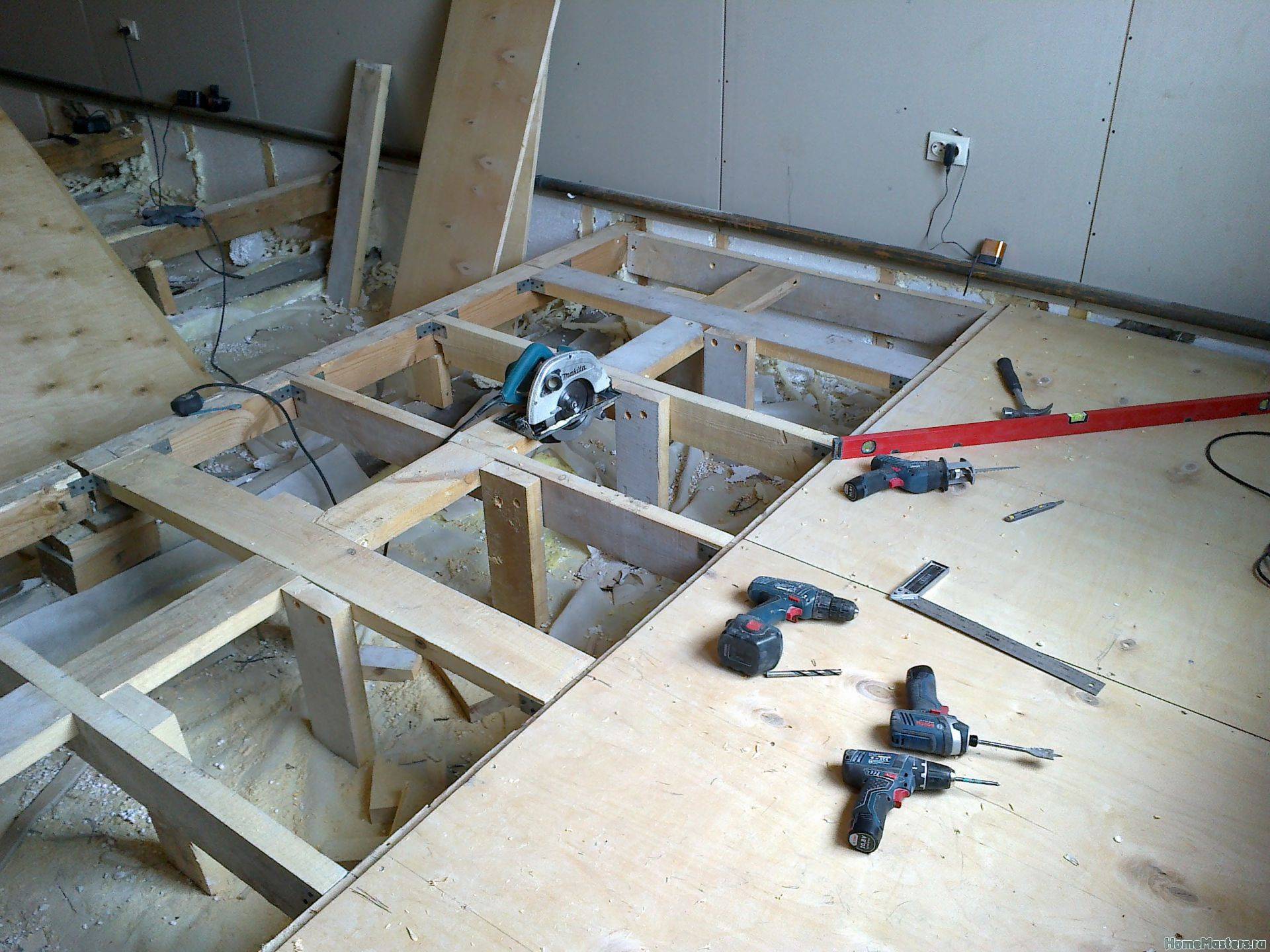- Листы фанеры укладывают на эти саморезы. Так как под ними будет образовываться пустота, нужно заполнить её, чтобы исключить прогибания.
