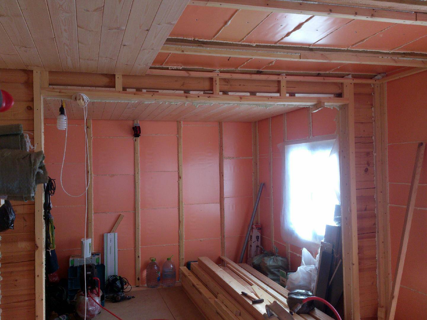На плёнку устанавливается обрешётка, шаг определяется в зависимости от ширины утепляющего материала. В данном случае речь идёт о минеральной вате. Такой материал часто используют при внутренних работах, но он в обязательном порядке требует укрытия изоляционной плёнкой с 2 х сторон (как показано на фото). Нужно помнить, что точка росы переносится в утеплитель, ближе к стене. После укладки утеплителя он накрывается плёнкой