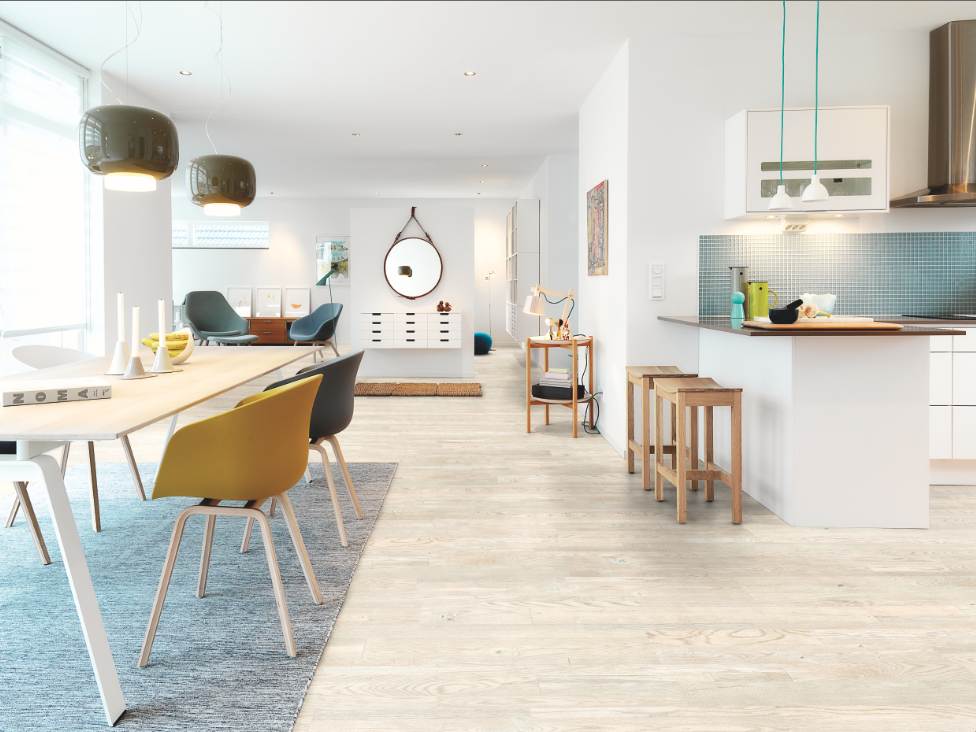 Выбирая белый ламинат для кухни, цвета и оттенки предметов интерьера можно смело доверить своей фантазии. Ведь он практически универсален в любом стиле. Поэтому испортить интерьер будет сложно. Кухня в белом цвете значительно расширит пространство и придаст ему лёгкость.
