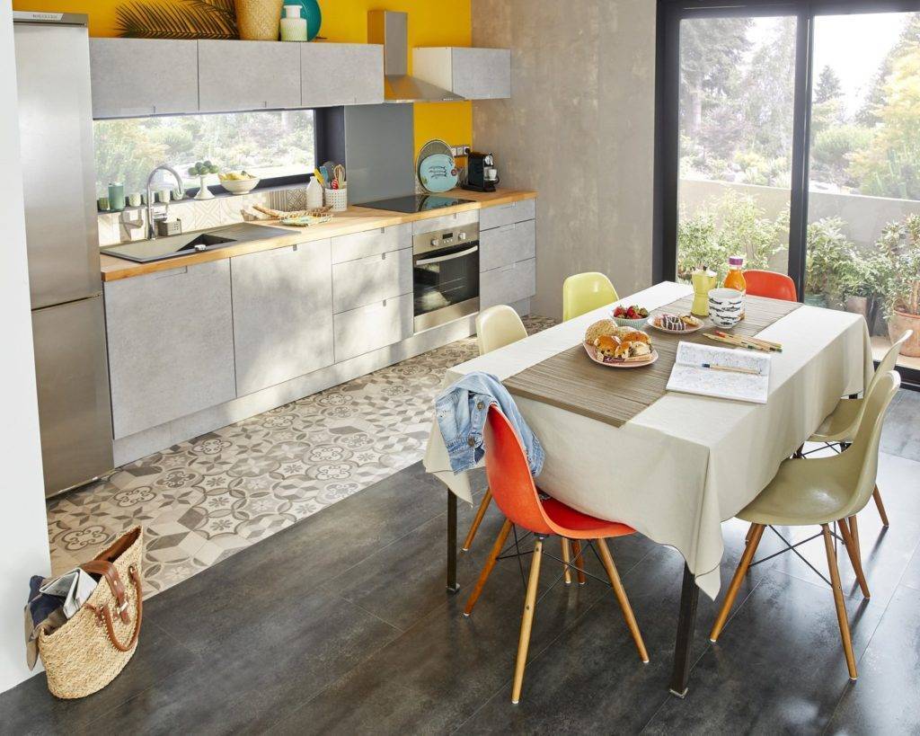 Его место занимает более практичная плитка. С одной стороны, можно выгадать небольшую экономию на стоимости материалов. С другой, получается интересное дизайнерское решение, позволяющее зрительно разделить рабочую зону кухни от столовой. Но такой вариант не подходит для маленькой кухни, поскольку визуально сделает ее еще меньше