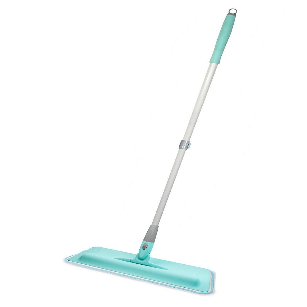 Насадка шириной 28 см имеет конструкцию плоский моп, что эффективно моет углы, узкие места под мебелью, собирает мелкий мусор и пыль. Инструмент выполнен в нежных серо-голубых тонах, органично смотрится в помещении при хранении.