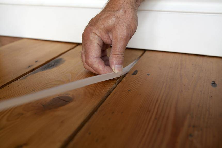 - Натуральная деревянная доска – «живой» материал, изменяющий свои характеристики под влиянием внешних условий. Из-за изменения температуры и влажности значительно колеблются линейные размеры досок, в стыках между ними могут появляться щели. Устранить щели можно двумя способами – перестилкой покрытия или герметизацией больших зазоров. Первый способ очень трудоемкий, требует не только больших затрат времени, но и денег. Для полной перестилки пола нужно полностью освобождать помещение, во время работ образуется большое количество строительного мусора. Кроме того, при демонтаже старого покрытия всегда определенное количество материала приходится менять, необходимо искать полностью идентичные аналоги. Герметиком для пола можно заделывать щели без снятия покрытия – быстро, дешево и довольно надежно.