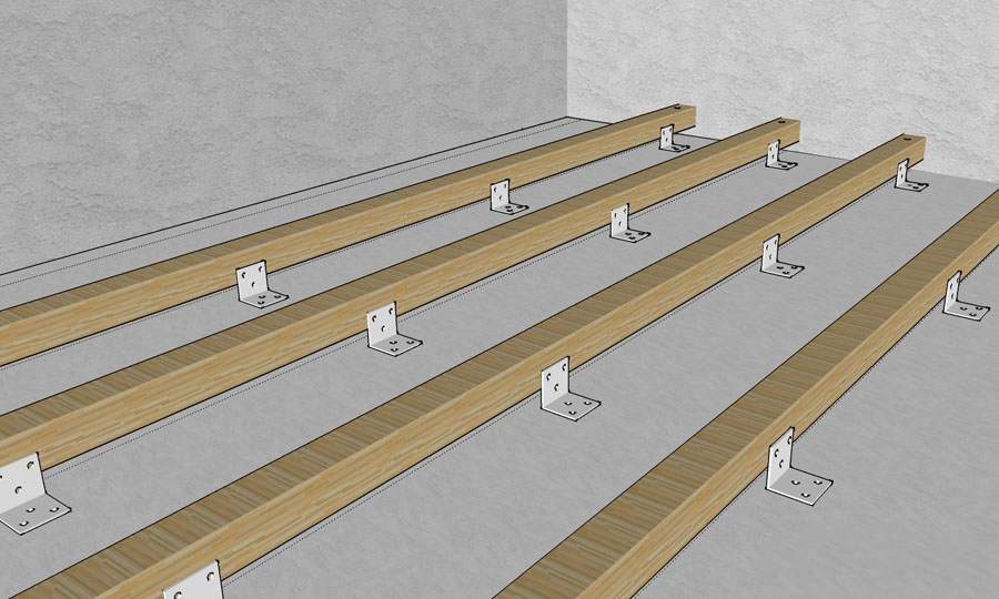 Монтаж несущих лаговых балок металлическим крепежом практически не отличается от анкерной схемы крепления. Вместо анкеров используются металлические уголки из стали, толщиной не менее 2 мм. На вертикальной полке крепления сверлят отверстия под саморезы.