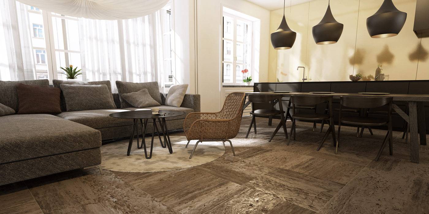 Прочность кварцвиниловой плитки обусловлена вхождением в ее состав до 80% кварцевого песка и армированние стеклохолстом.