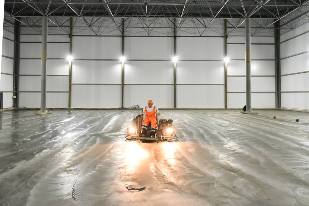 Топпинги (сухие упрочняющие смеси) наносятся еще на этапе застывания бетона и втираются в поверхность пола с помощью специальной затирочной машины.
