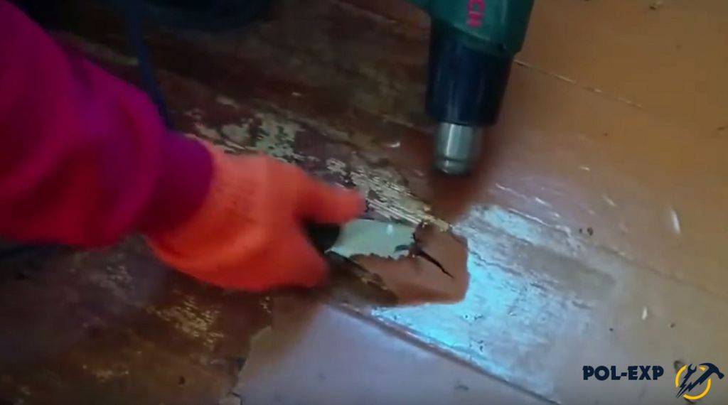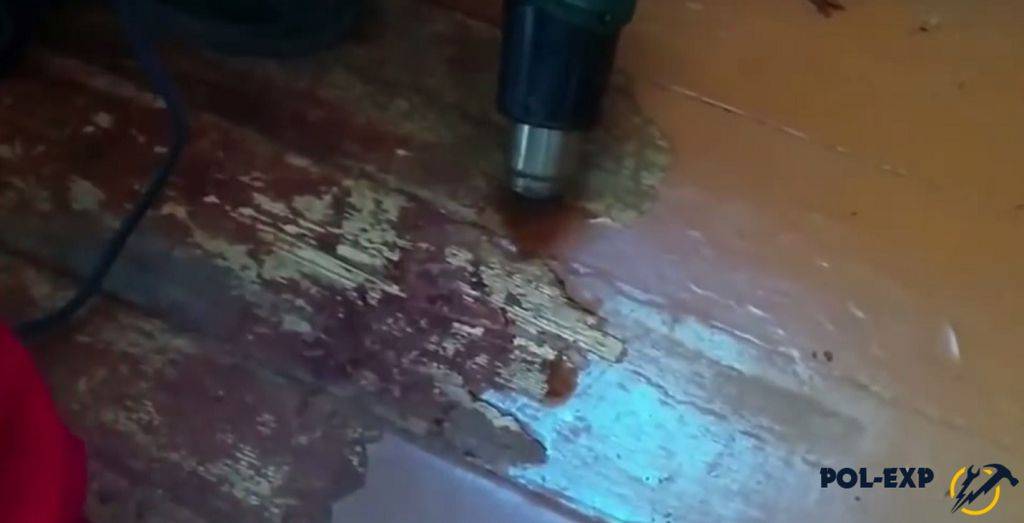 Рассмотрим, как происходит удаление краски с пола при помощи строительного фена и шпателя. Это комбинированный термомеханический метод.