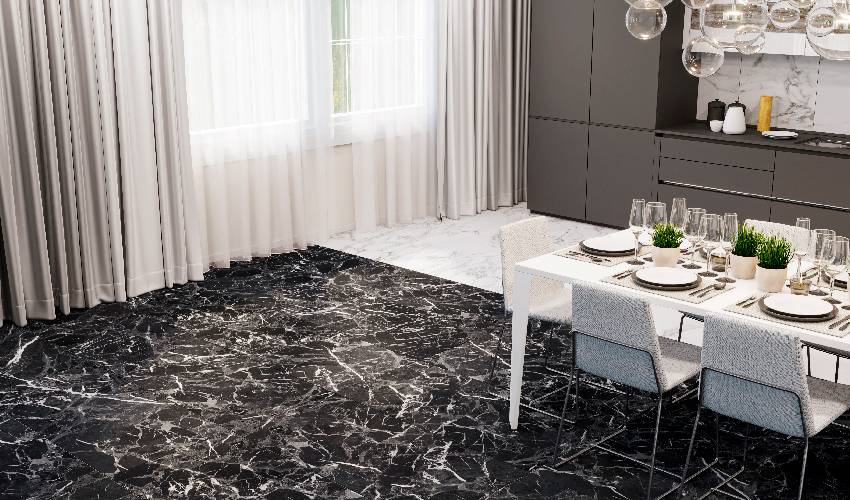 Керамика очень холодная, поэтому ее желательно сочетать с системой тёплых полов (благо материал обладает отличной теплопроводностью). Также можно отделать плиткой лишь рабочую зону, а столовую отделать более теплым материалом – деревом. Ниже на фото представлен пример комбинированных полов с плиткой и ламинатом.