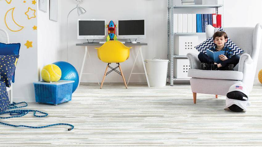 Вероятнее всего, вы захотите использовать спортивный линолеум, линолеум с шероховатой поверхностью или рельефным рисунком, чтобы ребёнку было удобнее играть. Также лучше выбрать линолеум из натуральных материалов.
