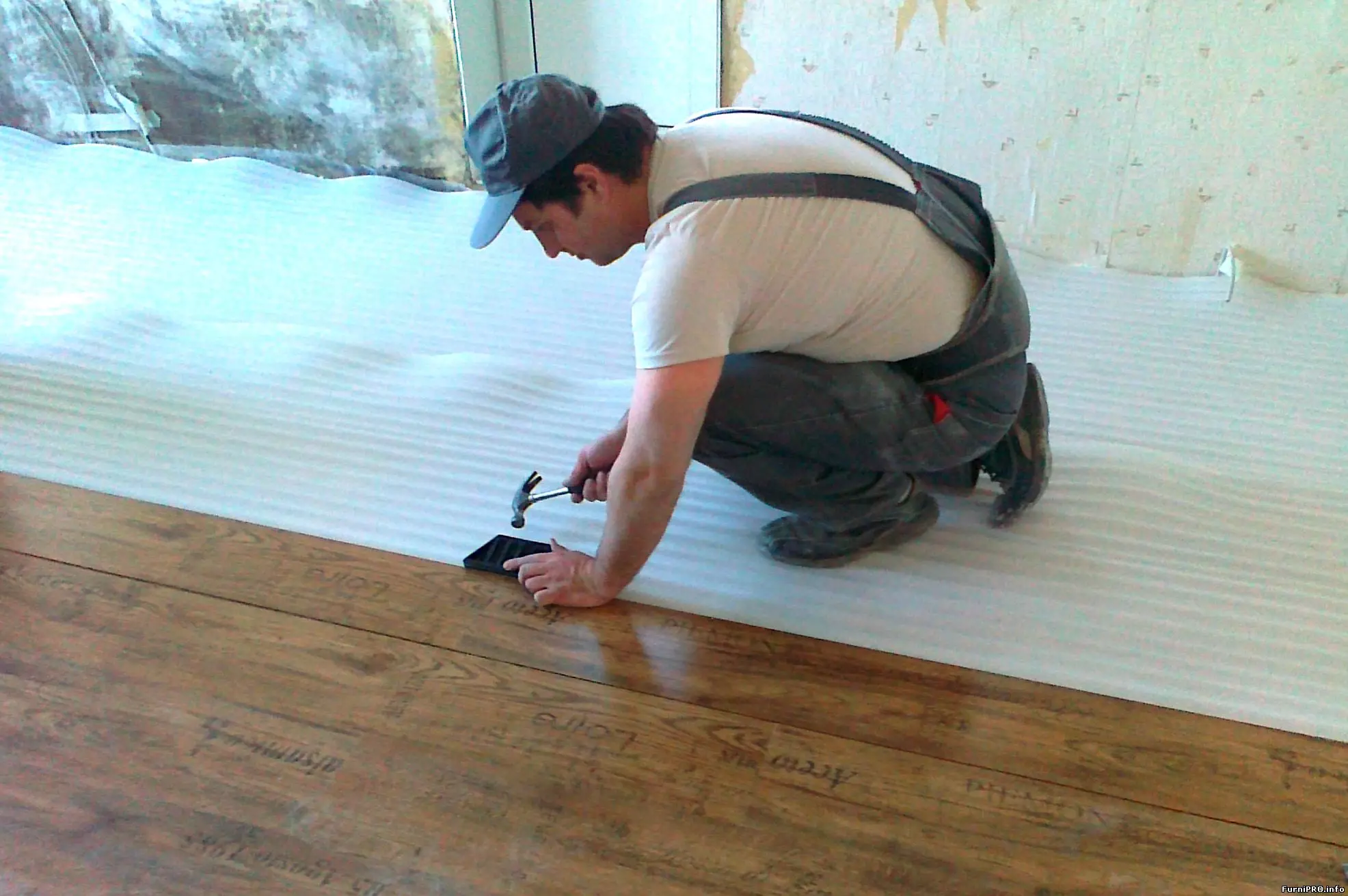 - подготавливается основа: она не должна иметь отклонений по горизонтали более чем на два миллиметра на один метр квадратный, укладывается подложка;