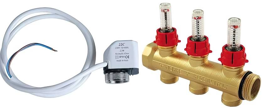На патрубках монтируются элементы управления – расходометры и запорные клапаны. Последние могут иметь механическую регулировку, либо комплектоваться сервоприводами. Это удобно для создания автоматической системы регулирования температуры поверхности пола. Запорные клапаны подключаются к терморегулятору, который корректирует положение их штоков в зависимости от температуры нагрева пола или воздуха в помещении.