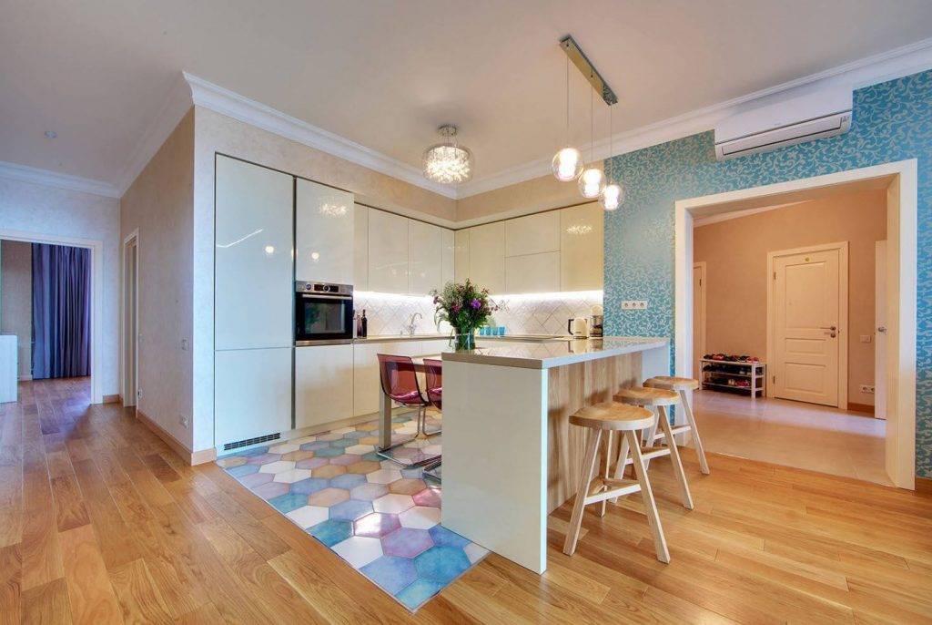 Сочетание плитки и ламината в кухне-гостиной