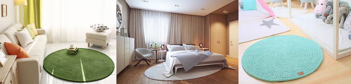 Если же нужно привлечь внимание, следует уложить круглый ковер из вискозы или другого материала, цвет и фактура которого резко отличается от остальных предметов интерьера. Комнату, выполненную в тусклых тонах, украсит круглый ковер яркой расцветки