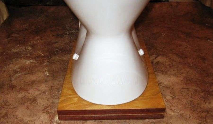 Для этих целей используют деревянную доску для обустройства подставки. Ее необходимо изготовить точно так же, как и прокладку из резины или линолеума, после этого «посадить» деревянное изделие на герметик, нанести на него слой герметика и уже сверху получившейся конструкции положить прокладку. Если все сделать точно по размерам ножки унитаза, то получится надежная конструкция.