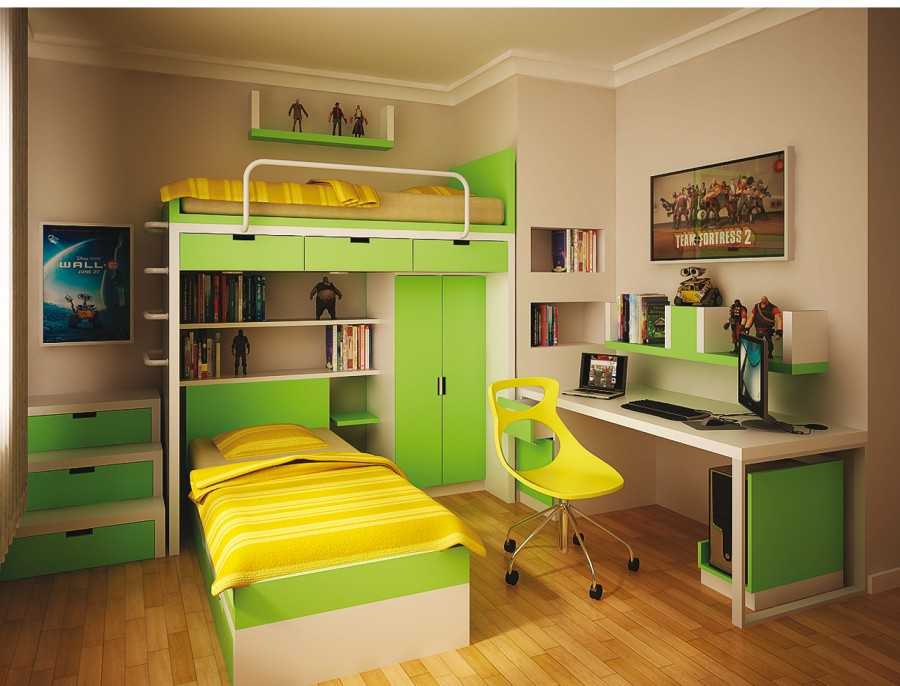 Если детей двое, то можно использовать двухъярусную кровать, если ребенок один, то пространство можно увеличить приобретя кровать-чердак, которая включает себя игровую, рабочую зону и спальное место.