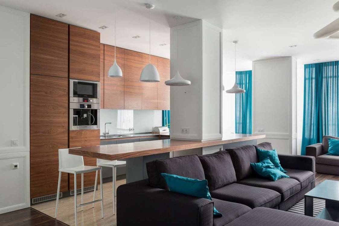Можно сделать одну из стен акцентной или выполнить дизайн жилой и кухонной зон разными материалами.