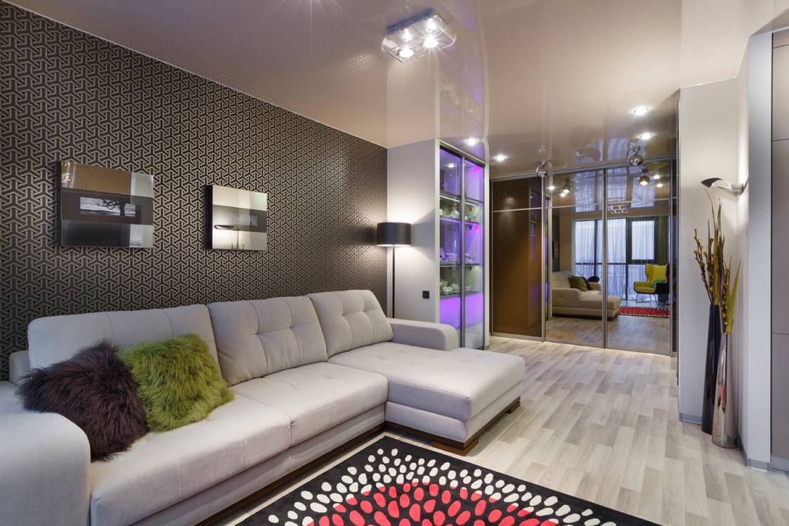 Хорошо подойдут для ремонта однокомнатной квартиры навесные потолки со встроенными светильниками. Такая конструкция легко монтируется и позволяет равномерно разместить несколько точек освещения по площади потолка.