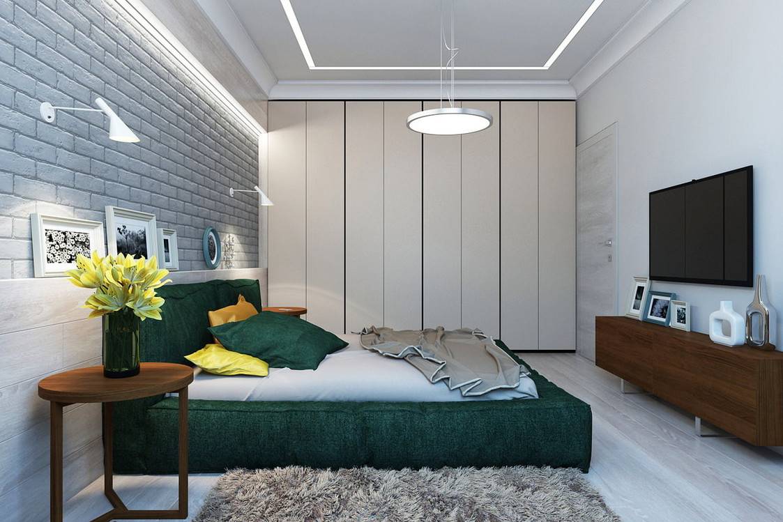 Небольшие помещения следует оформлять в светлых тонах. Исключением может стать использование темных оттенков на одной из акцентных стен. Такой дизайнерский секрет добавит дополнительной глубины помещению и приумножит свободное пространство, как видно на фото интерьера однокомнатной квартиры 20 кв.м.