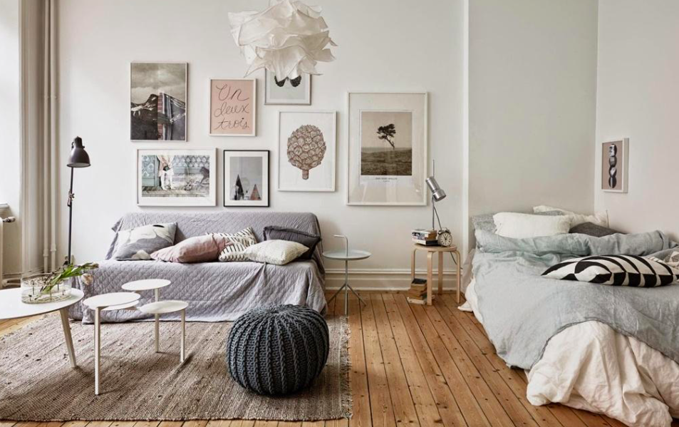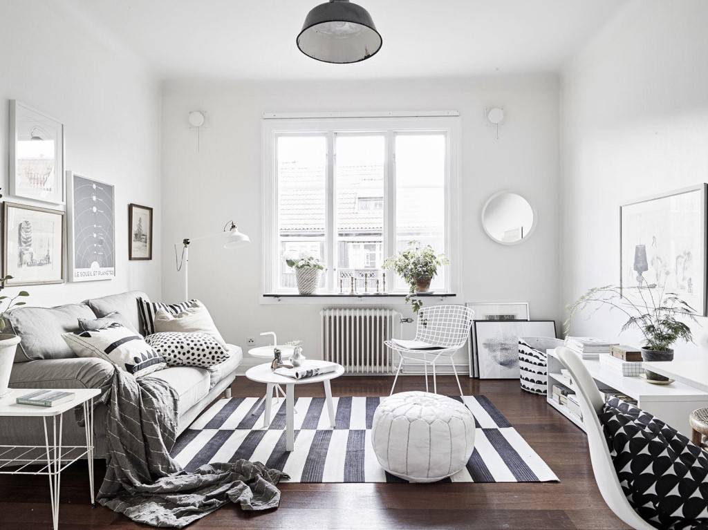 Маленькая квартира кажется больше, если её стены покрыты белой или светло-серой краской: так они отражают естественный свет. Скандинавы пользуются этим приёмом повсеместно, а нехватку цвета компенсируют яркими акцентными деталями: цветными подушками на диване, картинами, коврами.