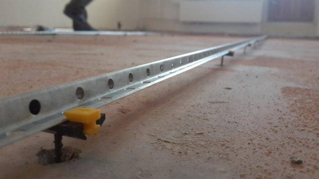 на саморезы укладывается профиль (самый популярный вариант – профиль размерами 27х28 мм, предназначенный для крепления гипсокартона), используемый для обустройства маяка, и выверяется по уровню.