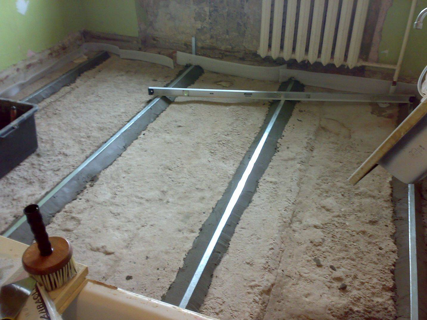 Если нет профиля, то можно использовать обычные трубы, которые устанавливаются на раствор. После заливки стяжки трубы вытягивают, а образовавшуюся канавку заливают раствором.