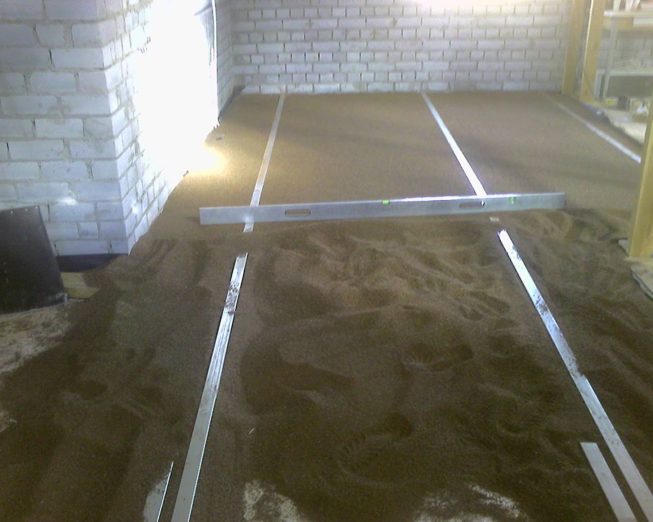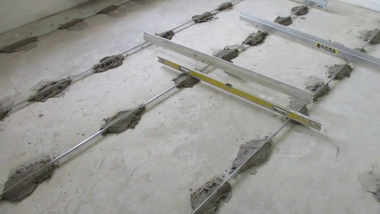 При монтаже профилей необходимо постоянно проверять горизонтальность и ровность создаваемой поверхности. Стяжку начинают заливать после полного застывания раствора под направляющими.