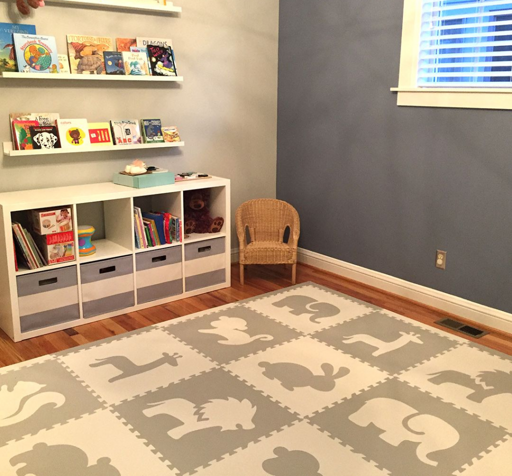 Ниже представлен похожий вариант. Отличие состоит в том, что модули собраны в виде отдельного коврика, который можно сместить в сторону. Такой вариант актуален для семей, проживающих с ребенком в одной комнате. Коврик визуально отделит игровую зону от остального пространства.