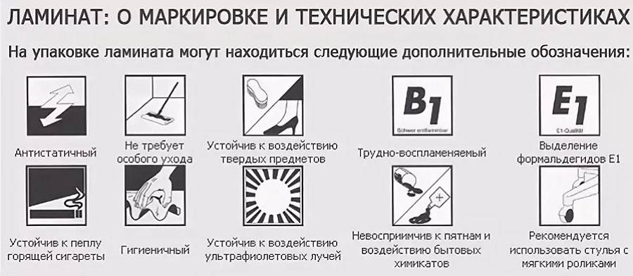 На упаковке ламината, предназначенного для использования в жилых помещениях, всегда наносится пиктограмма домика. В зависимости от уровня нагрузки, выдерживаемой ламинатом без быстрого износа и потери прочности, указывается 1, 2 или 3 человеческие фигурки. Износостойкость маркируется аббревиатурами АС1-3 или W 1-3