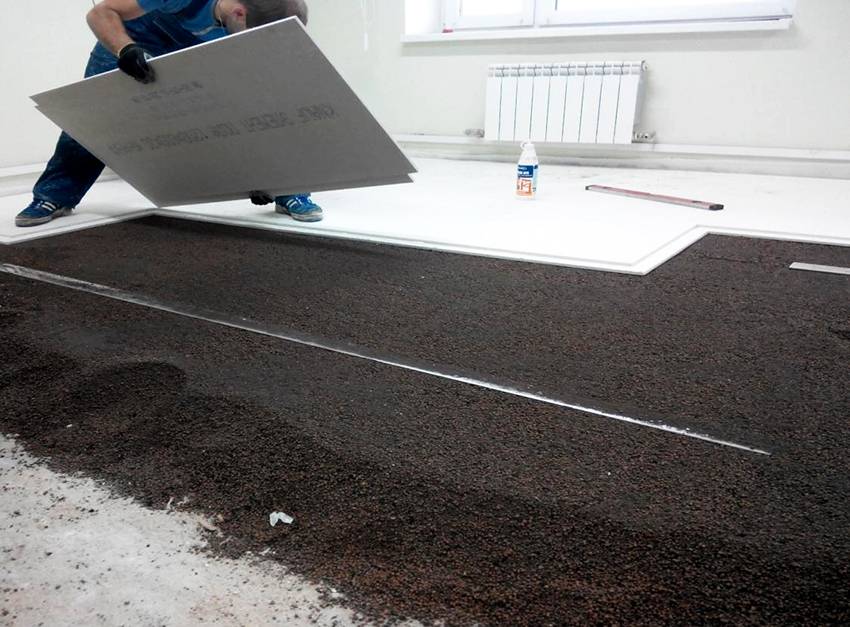 - Твердое листовое покрытие. Используют гипсоволокнистые плиты, которые укладывают на засыпную часть. Далее идет любое финишное покрытие.