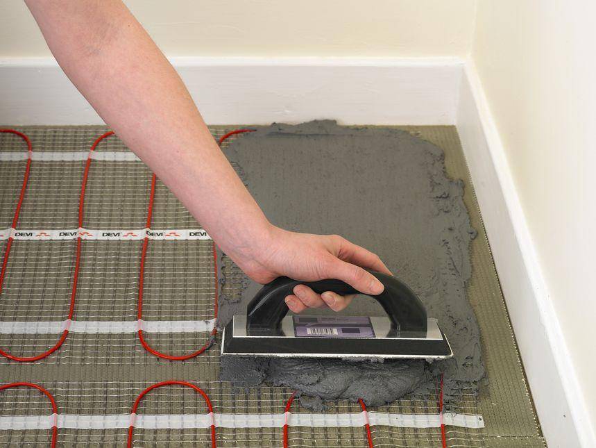 Возможность смонтировать электрический теплый пол без стяжки под плитку обеспечивают вышеупомянутые греющие маты. Они представляют собой модульные конструкции, уже готовые для проведения монтажных работ – это небольшие участки из прочной сетки, на которых закреплены отрезки греющего кабеля. Раскатываем на ровной поверхности, наносим клей, укладываем плитку, даем высохнуть – теперь все готово, можно смело ходить по ней и ставить мебель.
