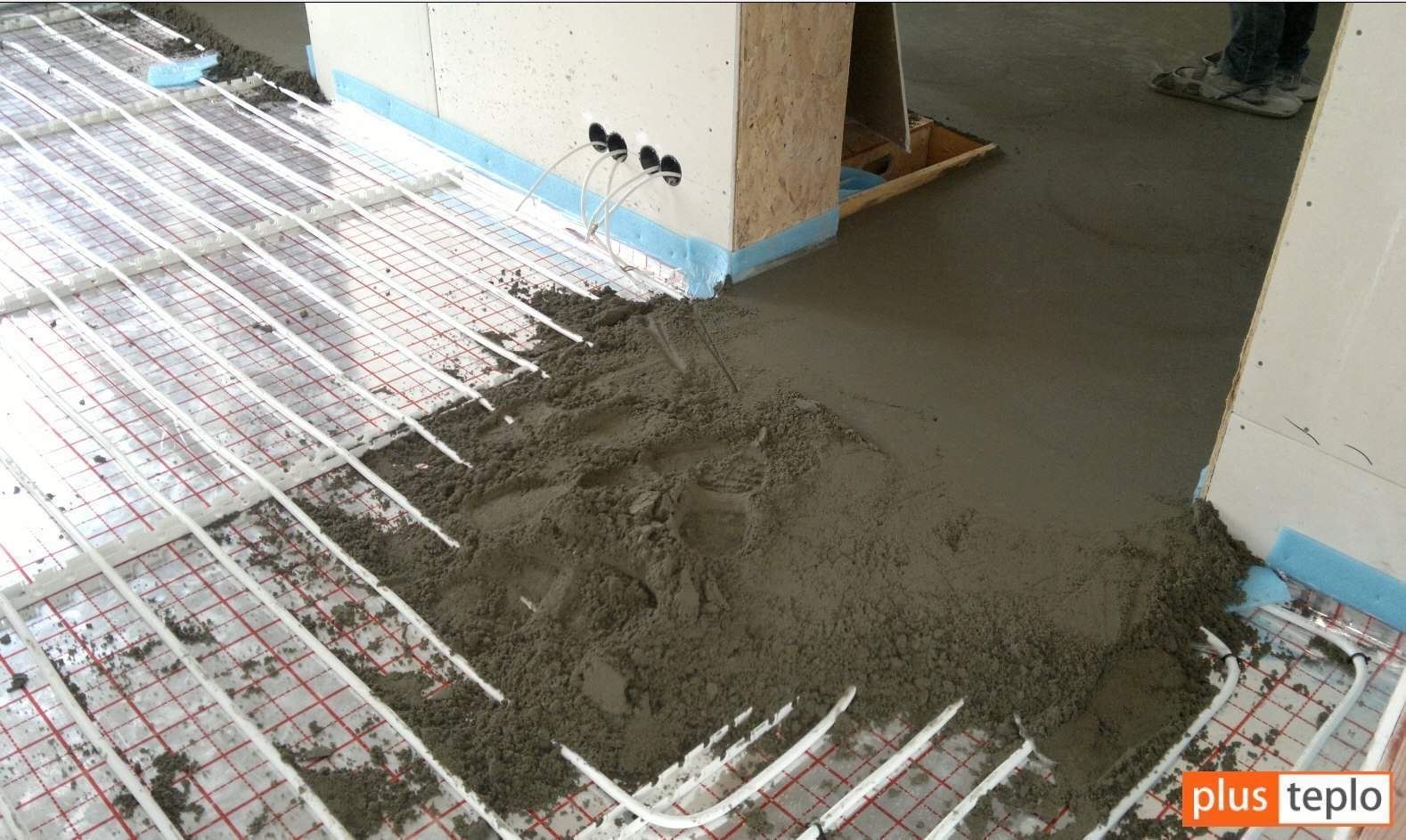 - Для укладки водяных труб потребуется мощная бетонная стяжка – она заливается поверх уложенных труб, ее толщина достигает 70-80 мм;
