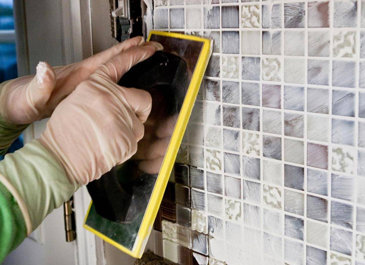 - Затирка швов. Мокрой губкой увлажняются швы, аккуратненько наносится затирка с использованием резинового шпателя.