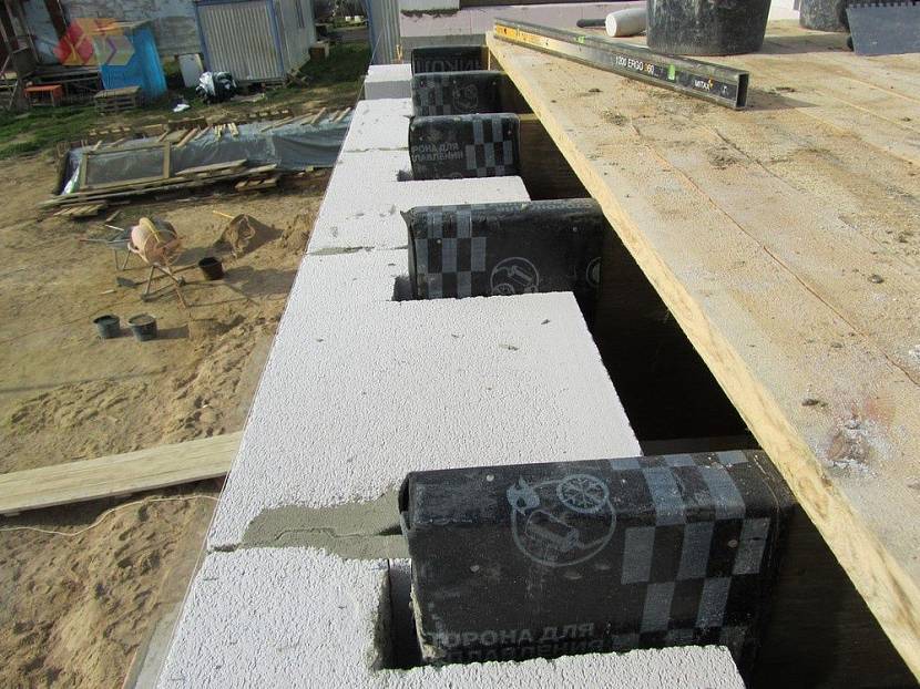 Перед сооружением перекрытия делается армопояс, так как газобетонные блоки – хрупкий материал, который легко лопнет под нагрузкой. Под армопояс следует соорудить деревянную опалубку, повторяющую контур стен