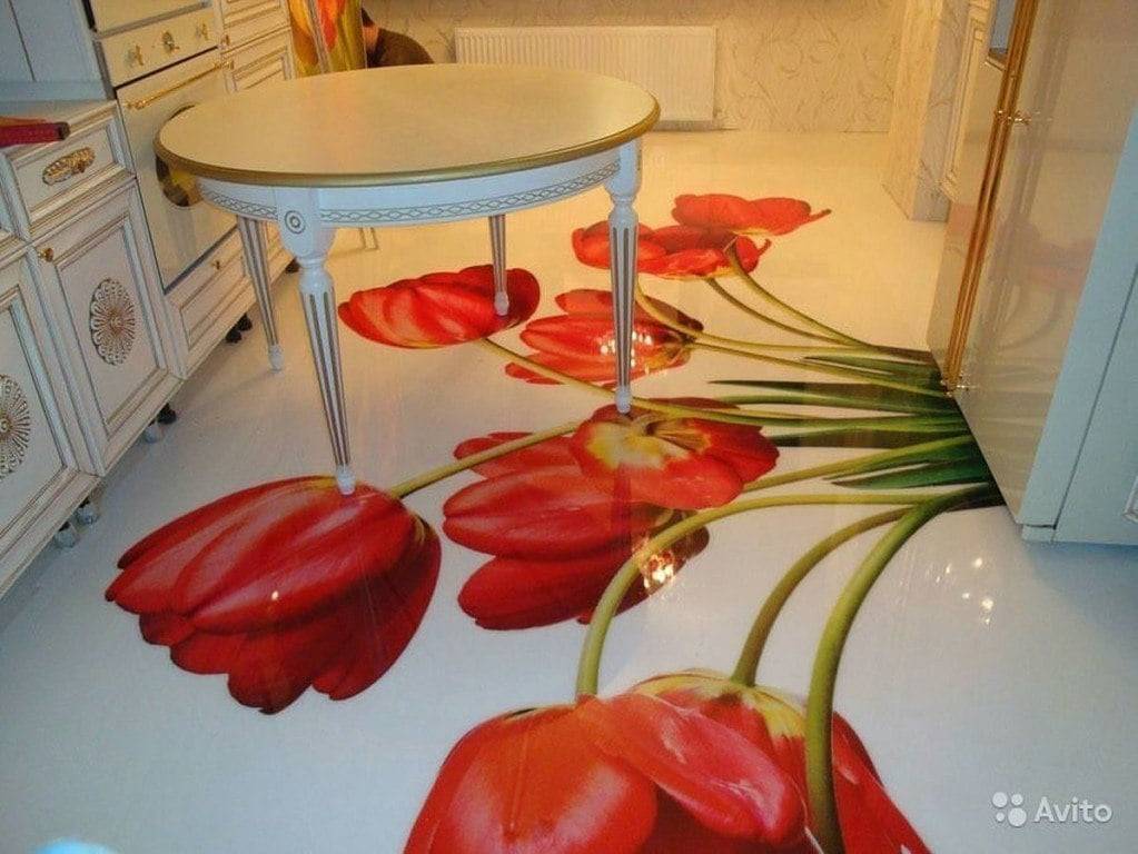 - Эпоксидный наливной пол для кухни – эталон долговечности. Он сопротивляется химии, ультрафиолету, с его помощью можно создать поверхность с рисунком или 3Д эффектом.