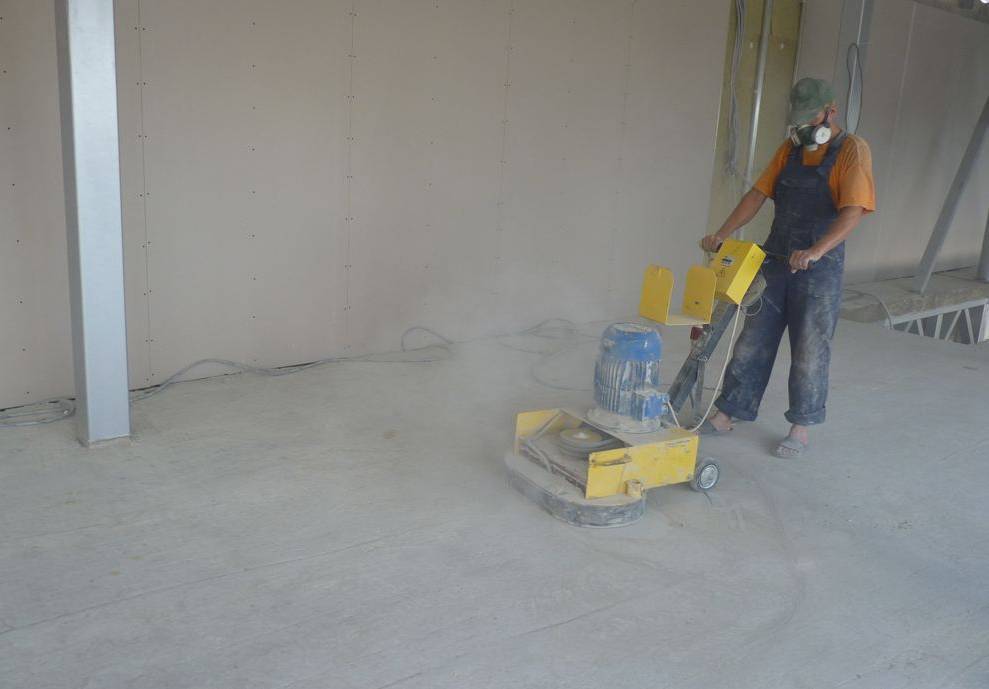 После высыхания пол рекомендуется освободить от верхнего слабого слоя толщиной 2-3 мм. Это так называемое цементное молочко, которое удаляется скребком или мозаично-шлифовальной машиной с фрезой грубой обработки зернистостью до 600 единиц.