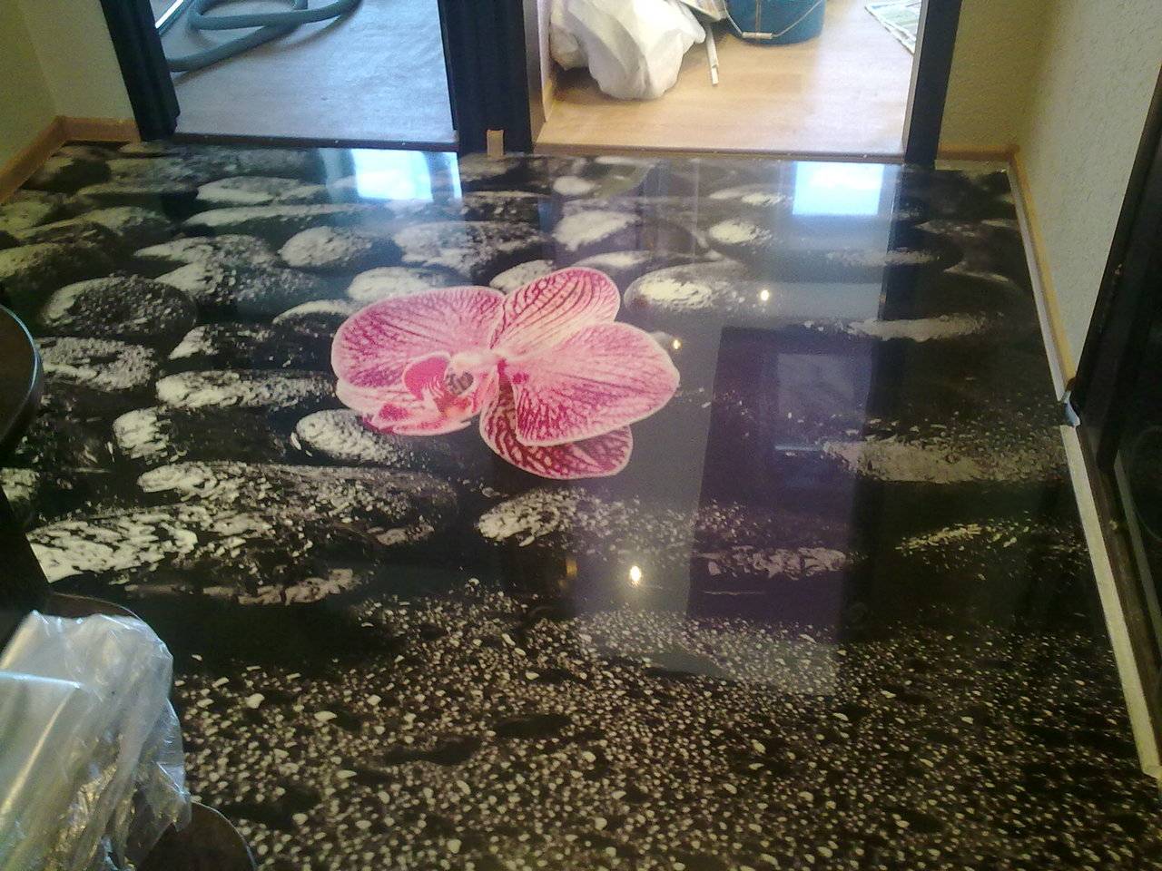 Перед тем как наносить заключительный пласт наливного эпоксидного пола, на базовый слой накладывают декоративное покрытие. Это может быть просто прослойка из декорирующих чипсов. Самыми оригинальными вариантами будут роспись поверхности акриловыми красками или баннерная сеть с любым цифровым изображением. Особый шик половому покрытию придаст современная объемная печать понравившегося вам изображения.