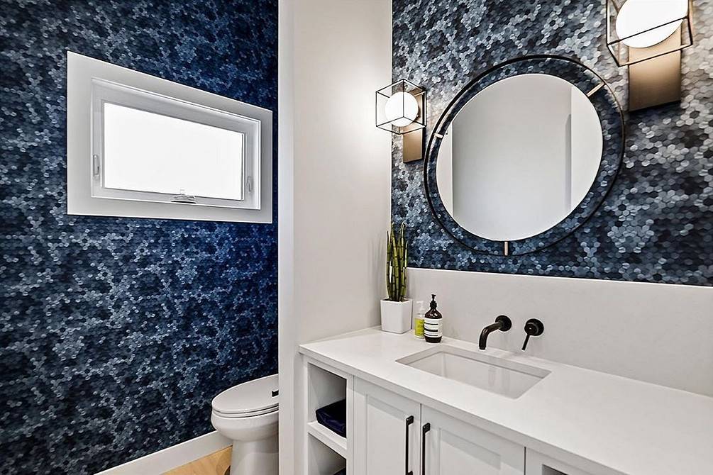 На фото мозаика синего цвета на стенах в интерьере современной ванной комнаты.