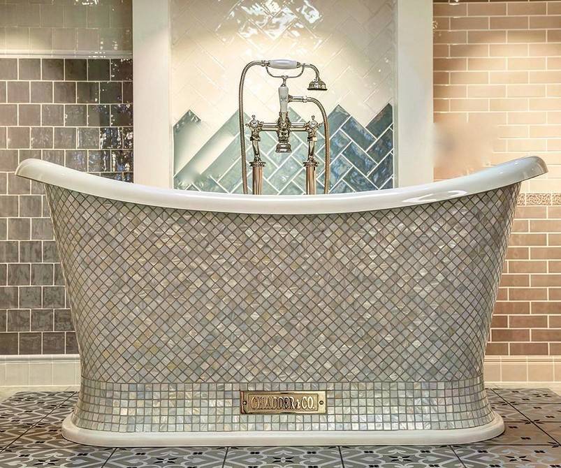 Наиболее подходящий вид мозаики в дизайн маленькой ванной — зеркальная. Она визуально увеличивает пространство. Кажущаяся хрупкость обманчива: на самом деле повредить её довольно сложно. С её помощью оформляют и стены, и отдельные элементы, например, экран ванны.