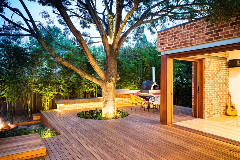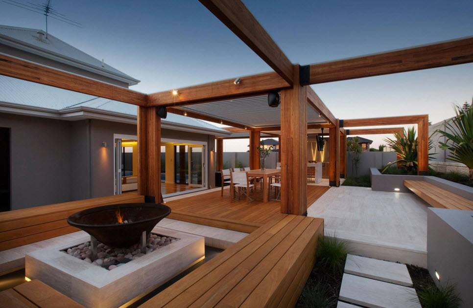 Дерево, как правило, благодарно принимает соседство с разными текстурными материалами. Разрабатывая дизайн патио, можно сочетать деревянный настил с площадками из гравия и керамической плитки, островками газона и небольшими цветочными клумбами. Очень удачно смотрится цветовая перекличка или один и тот же оттенок между настилом и элементами ограды, контейнерами для цветов, беседкой. Дополнительный эффект придают различные светильники, лесенки, ступени.