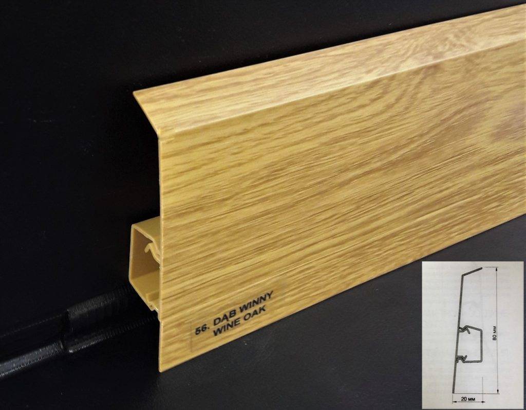 Эта популярная модель характеризуется наличием сглаженных краев, и относится к категории прямых. Окрас – качественная имитация под дерево. Заявленные габариты: 80х16 мм, при длине – 240 см. Отличный способ скрыть имеющиеся погрешности ремонта и убрать подальше от глаз телекоммуникации. Такое изделие поможет придать комнате законченный вид и дополнить выбранное напольное покрытие. В основе лежит использование прессованной древесной щепы. Внешне не отличается от натурального дерева, и станет отличным дополнением к паркету или ламинату. Для оформления углов следует прибегнуть к ручному запилу под углом 45°. Отдельного внимания заслуживает наличие специальной борозды под кабель. Монтаж осуществляется посредством строительного клея или специальных клипс. Окрас – светло-коричневый. Производится в России.